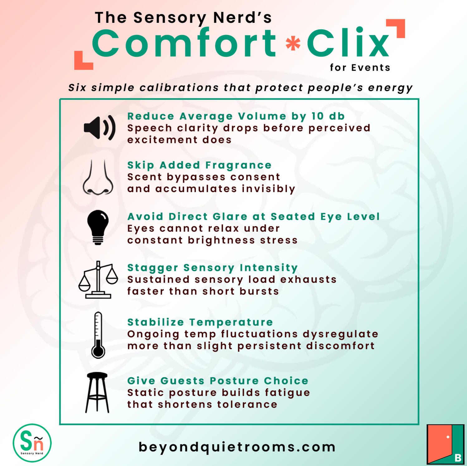 Comfort supports focus, connection, safety, and community. Balanced environments reduce overwhelm for everyone, not only neurodivergent individuals.• Avoid costly mistakes