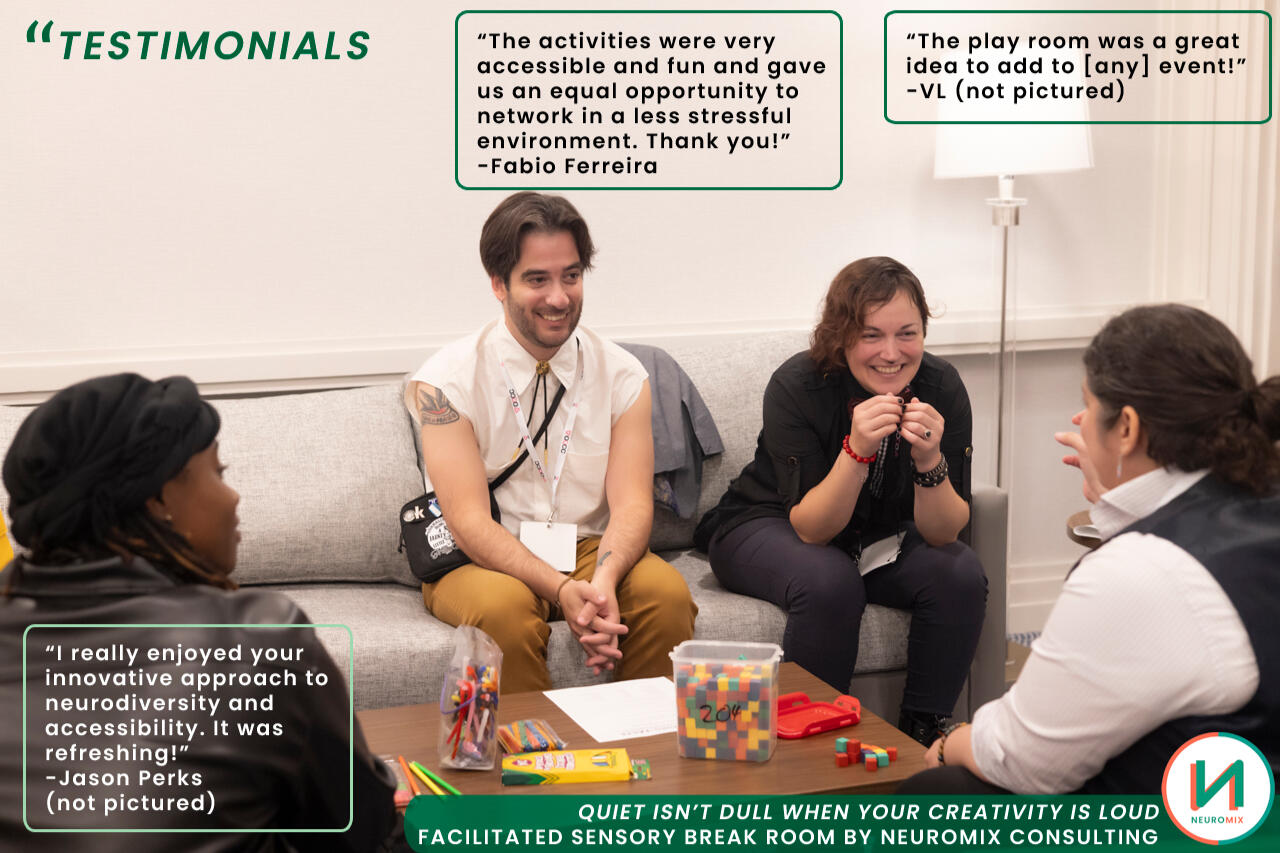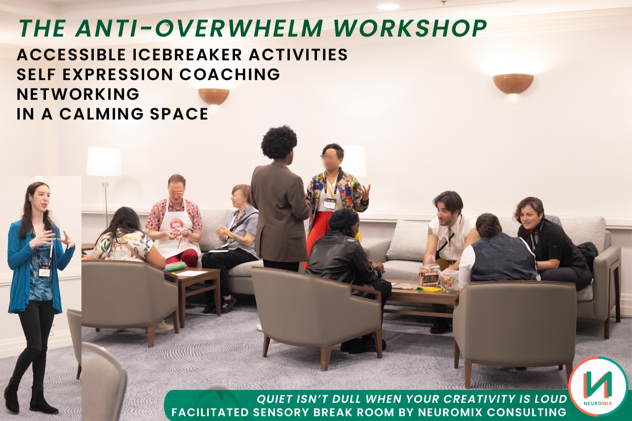 For Teams & Organizations• Re-energize staff during crunch periods or after long projects.• Reduce burnout and stress with practical, playful reset activities.• Improve morale and productivity by creating space for comfort and connection.Book a Team WorkshopFor Conferences & Events• Transform overstimulation into inclusion with a sensory-friendly break space.• Offer attendees a chance to recharge while still engaging meaningfully.• Elevate your event reputation by being remembered as welcoming, not overwhelming.Book an Event Session